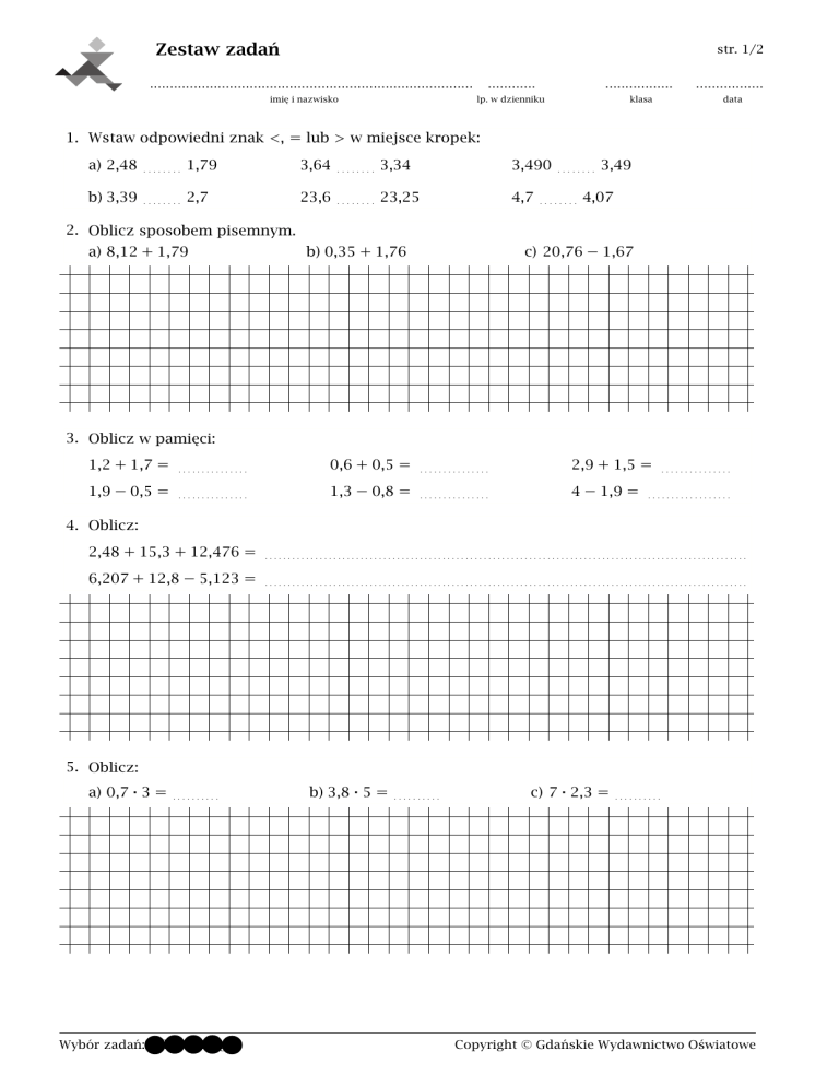 1. Wstaw odpowiedni znak <, = lub > w miejsce kropek: