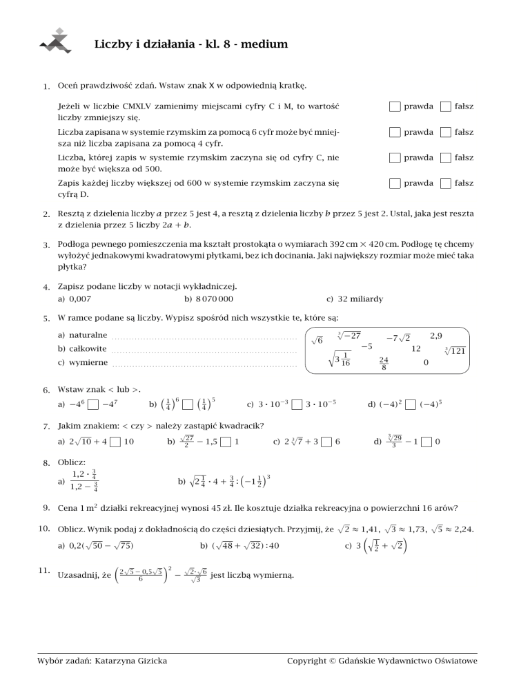 Liczby i działania - kl. 8 - medium 1. Oceń prawdziwość zdań. Wstaw znak X w odpowiednią kratkę. Jeżeli w liczbie CMXLV zamienimy miejscami cyfry C i M, to wartość prawda fałsz prawda fałsz prawda fałsz prawda fałsz liczby zmniejszy się. Liczba zapisana w systemie rzymskim za pomocą 6 cyfr może być mniejsza niż liczba zapisana za pomocą 4 cyfr. Liczba, której zapis w systemie rzymskim zaczyna się od cyfry C, nie może być większa od 500. Zapis każdej liczby większej od 600 w systemie rzymskim zaczyna się cyfrą D. 2. Resztą z dzielenia liczby 𝑎 przez 5 jest 4, a resztą z dzielenia liczby 𝑏 przez 5 jest 2. Ustal, jaka jest reszta z dzielenia przez 5 liczby 2𝑎 + 𝑏. 3. Podłoga pewnego pomieszczenia ma kształt prostokąta o wymiarach 392 cm × 420 cm. Podłogę tę chcemy wyłożyć jednakowymi kwadratowymi płytkami, bez ich docinania. Jaki największy rozmiar może mieć taka płytka? 4. Zapisz podane liczby w notacji wykładniczej. a) 0,007 b) 8 070 000 c) 32 miliardy 5. W ramce podane są liczby. Wypisz spośród nich wszystkie te, które są: a) naturalne . . . . . . . . . . . . . . . . . . . . . . . . . . . . . . . . . . . . . . . . . . . . . . . . . . . . . . . . . . . . . . . . . 3 √−27 −5 √6 b) całkowite . . . . . . . . . . . . . . . . . . . . . . . . . . . . . . . . . . . . . . . . . . . . . . . . . . . . . . . . . . . . . . . . . 12 1 3 √ 16 c) wymierne . . . . . . . . . . . . . . . . . . . . . . . . . . . . . . . . . . . . . . . . . . . . . . . . . . . . . . . . . . . . . . . . . 2,9 −7√2 3 √121 24 8 0 d) (−4)2 (−4)5 6. Wstaw znak < lub >. a) −46 1 6 −47 1 5 b) ( 4 ) c) 3 ⋅ 10−3 (4) 3 ⋅ 10−5 7. Jakim znakiem: < czy > należy zastąpić kwadracik? a) 2√10 + 4 10 b) 8. Oblicz: 1,2 ⋅ 34 a) 1,2 − 34 √27 2 − 1,5 1 3 1 3 c) 2 √7 + 3 6 3 d) √29 3 −1 0 1 3 b) √2 4 ⋅ 4 + 4 : (−1 2 ) 9. Cena 1 m2 działki rekreacyjnej wynosi 45 zł. Ile kosztuje działka rekreacyjna o powierzchni 16 arów? 10. Oblicz. Wynik podaj z dokładnością do części dziesiątych. Przyjmij, że √2 ≈ 1,41, √3 ≈ 1,73, √5 ≈ 2,24. 11. Uzasadnij, że ( 2√5 − 0,5√5 ) 6 1 b) (√48 + √32) : 40 a) 0,2(√50 − √75) 2 − c) 3 (√ 2 + √2) √2⋅√6 jest liczbą wymierną. √3 Wybór zadań: Katarzyna Gizicka 515861 Copyright © Gdańskie Wydawnictwo Oświatowe